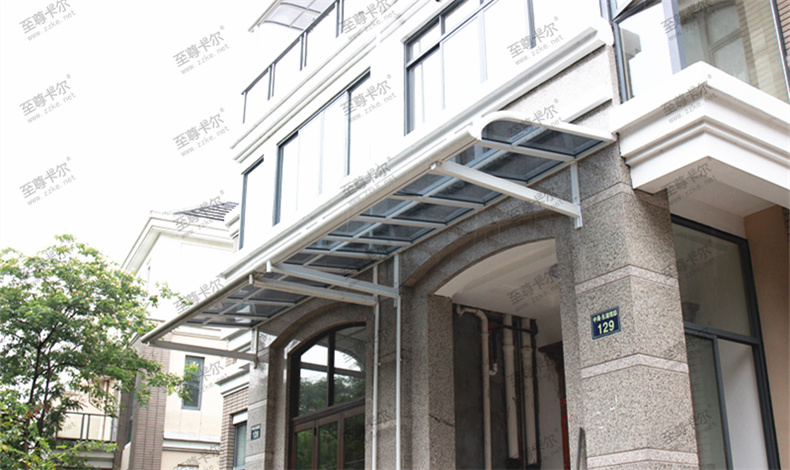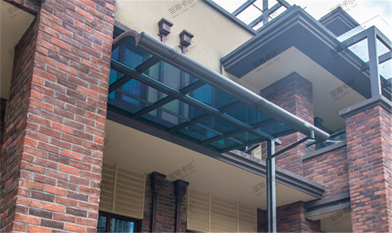 鋁合金雨棚不僅款式多樣,而且顏色也多樣,如至尊卡爾的鋁合金雨棚,鋁合金骨架可選顏色有香檳色、咖啡色、白色、黑色,頂棚可選顏色有深灰、淺灰、透明,豐富的顏色適合搭配不同的裝修風(fēng)格,讓房屋更美觀,看看下面這些鋁合金雨棚圖片大全。